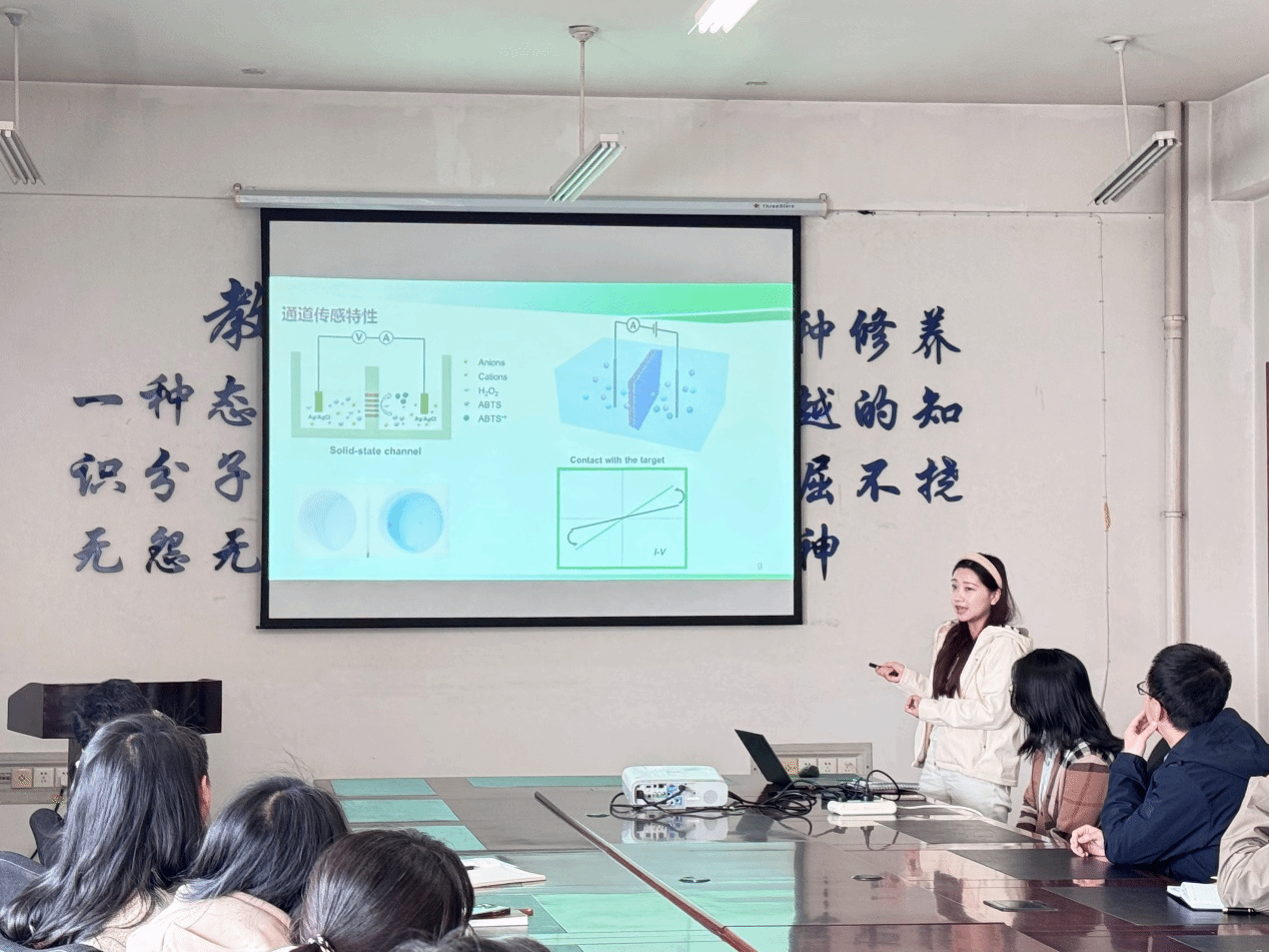 在题为《木质通道的构建与多功能传感应用》的报告中,赵俊剑博士系统介绍了天然木材在传感领域的研究进展与应用前景。报告从天然木材作为人类重要资源的历史背景出发,结合纳米技术的快速发展,阐述了木膜在现代传感领域中所展现出的巨大潜力。报告详细介绍了以木质纤维素膜为基础,构建天然酶-纳米酶级联传感平台的研究进展,并进一步探讨了无酶传感策略在小分子-大分子-病原微生物传感上的应用。此外,报告还展示了以木基材料为基础构建手性识别平台的最新成果,并对工业废弃物木质素在未来多功能传感中的应用进行了展望。报告结束后,赵俊剑博士与参会师生围绕天然木材批次间的稳定性问题、纳米酶与天然酶在传感应用中的优势与差异、以及可穿戴传感器的构建策略等方面展开了深入讨论。此次报告拓展了师生对木基材料在多功能传感器构建中应用前景的理解,激发了在新材料开发与可持续应用领域的研究兴趣。