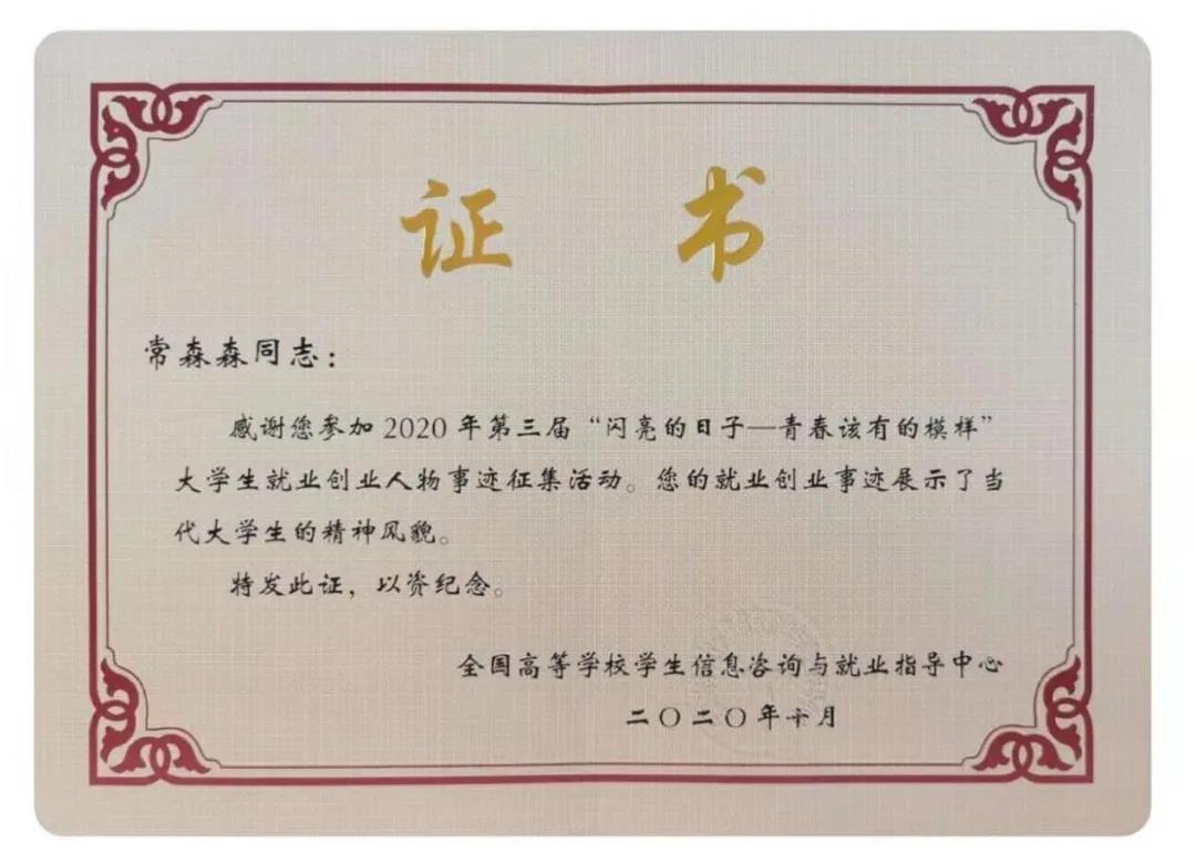 为解读当代学子的人生选择,理解他们的家国情怀,让默默耕耘却值得瞩目的基层青年、创业学子和军旅展示成为大学生和社会各界人士身边的榜样。2020年,教育部全国高等学生信息咨询与就业指导中心组织了第三届“闪亮的日子,青春该有的模样”大学生就业创业人物事迹征集活动。米兰2015级护理学专业常森森同学的先进事迹成功入选。