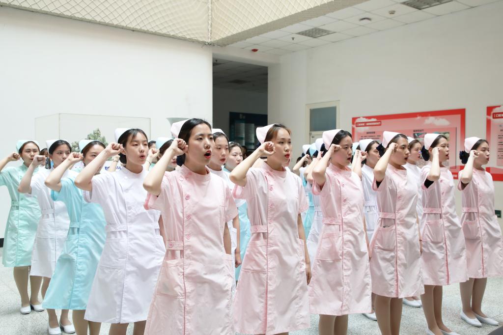 随后,在人文教研室主任张喜琰老师的领誓下,准护士们进行庄严的宣誓,“终身纯洁,忠贞职守,尽力提高护理之标准”,这阵阵誓言响彻整个会场,深深地震撼着每一个在场的学子,充分展示了她们愿为护理事业奉献青春和热血的决心。