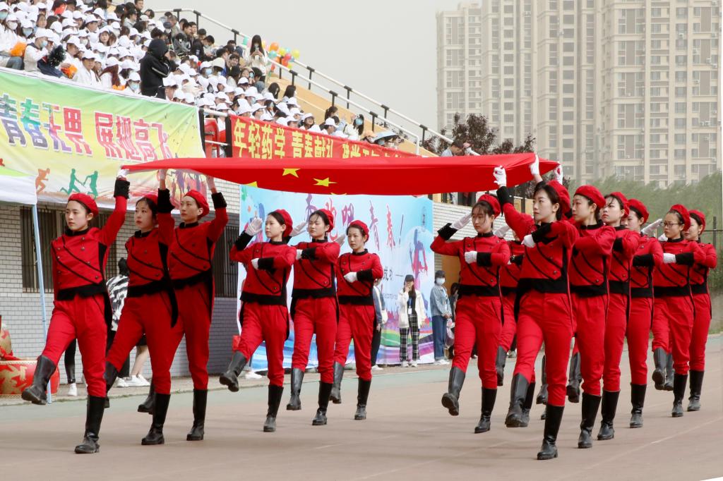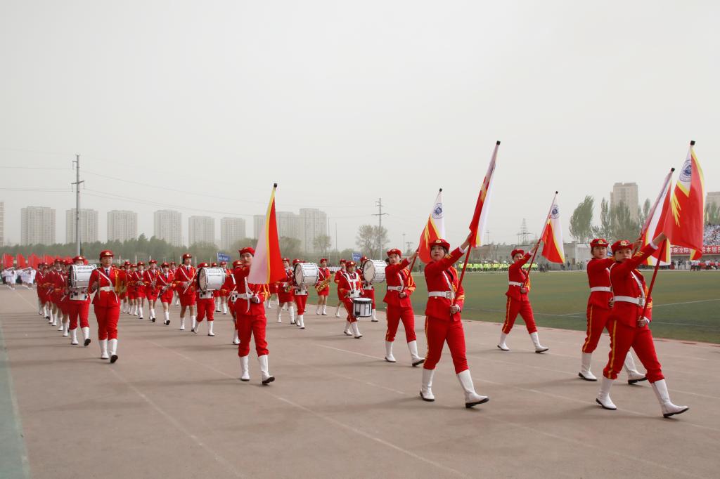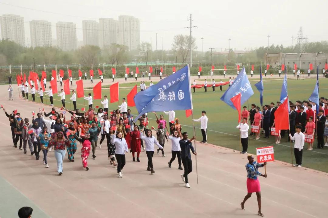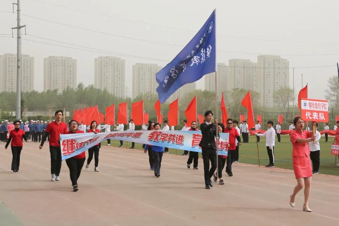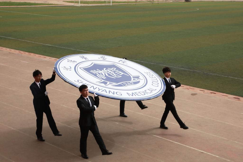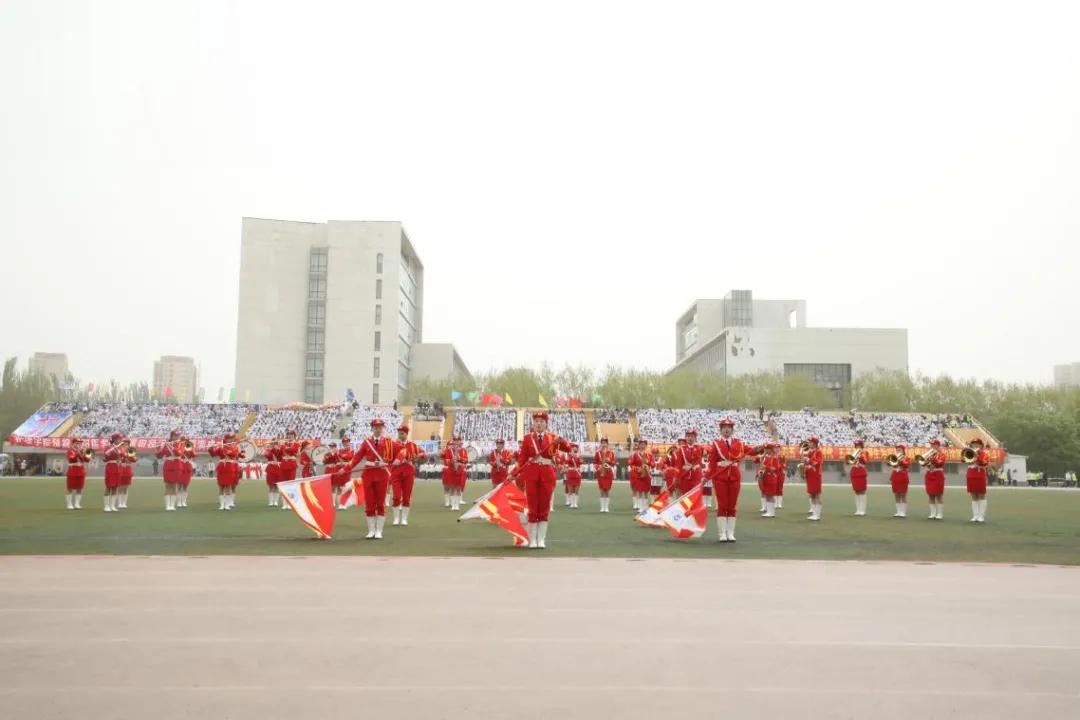 运动会伊始,踏步声伴着口号声,女子国旗护卫队引领着校旗队、校徽队、花束队、红旗队、裁判员方队、各学院方队、教职工方队依次走过主席台。