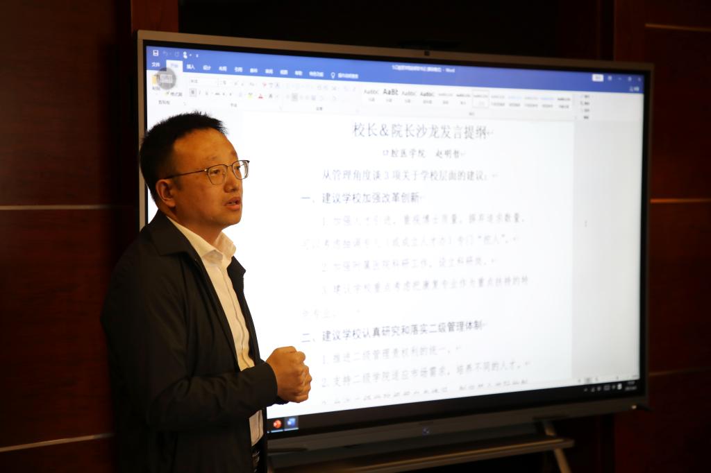 基础医学院张忠院长、康复医学院杨晓霞院长、口腔医学院党总支赵明哲书记、外语教学部姜春香主任等分别围绕学校特色专业建设、教研室主任聘任、人才引进、科研团队组建、学科建设、教考分离等多项内容展开精彩发言,做到了立意有高度、观点有深度、论据有广度,现场氛围热烈轻松。
