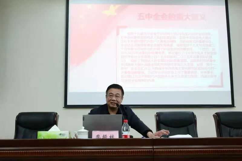 李振林副校长强调,学习宣传贯彻党的十九届五中全会精神,需要深刻了解“十三五”的伟大成就,需要深刻理解“十四五”面临的新形势新要求,需要深刻把握“十四五”时期经济社会发展的12项重点任务,学习宣传贯彻党的十九届五中全会精神,需要深刻把握新发展成就,切实增强民族自信心自豪感;需要深刻把握新发展阶段,锚定我国发展的历史坐标;需要深刻把握新发展目标,更加勠力同心奋勇前进;需要深刻把握新发展任务,坚定不移推动高质量发展;需要深刻把握创新核心地位,全面塑造发展新优势;需要深刻把握新发展格局,把握主动权下好先手棋。