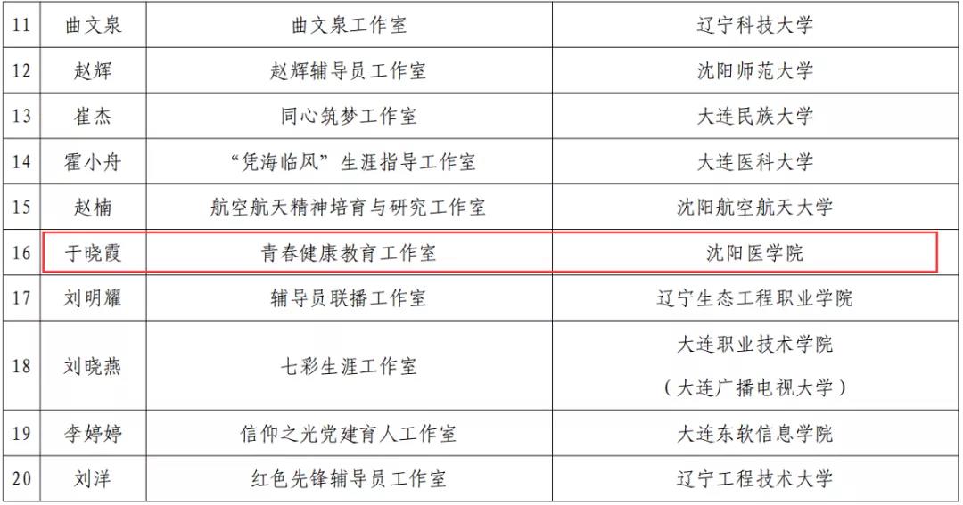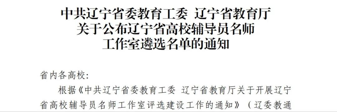 根据《中共辽宁省委教育工委辽宁省教育厅关于开展辽宁省高校辅导员名师工作室评选建设工作的通知》、《中共辽宁省委教育工委 辽宁省教育厅关于开展高校网络育人名师工作室建设暨高校网络教育名师培育工作的通知》,经个人申报、学校推荐、专家评审、网络答辩,米兰辅导员于晓霞老师的《青春健康教育工作室》获批“辽宁省高校辅导员名师工作室”,米兰辅导员齐柳老师的《“解忧杂货铺”网络思政工作室》获批“辽宁省高校网络育人名师工作室”,同时入选“辽宁省高校辅导员名师工作室”拟培育对象。