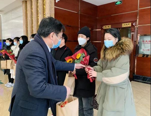 2021年新年伊始,伴随着新年的第一缕阳光,米兰milan官方网站研究生院为因疫情留校无法返回家中和岗位的研究生同学们准备了一份温暖的惊喜。1月1日上午,党委书记陶庆才、副院长朱启文、副院长韩松、研究生院及相关部门负责人,为同学们发放了暖心礼包以及代表着阳光与温暖的向日葵鲜花,并在食堂为大家准备了一顿热气腾腾的饺子。