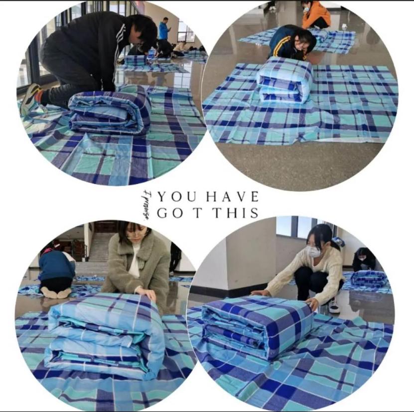 随着主持人宣布比赛开始,同学们立即进入状态,铺平、压实、翻折、抠角、捏线,熟练地将被子叠好。然后由学校领导、班主任老师、寝室管理员以及学生会组成的评委组逐一进行打分。