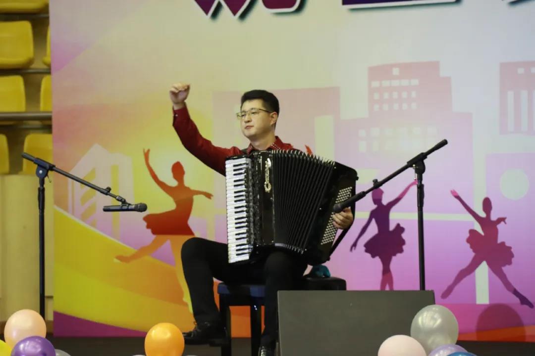 丛老师以一首《我的祖国》手风琴独奏开场,曲音婉转悠长,悦耳动听,让人陶醉其中,瞬时带动全场氛围,同学们用热烈的掌声感谢老师的倾情演奏。紧接着手风琴串烧《让我们荡起双桨》《歌声与微笑》《明天会更好》等曲目音符之间的频繁交替和激烈的情绪碰撞将音乐会推向了高潮。丛老师通过他娴熟的琴技和细致的音乐处理,向在座的师生充分表达了对手风琴和音乐的热爱,得到了现场师生们的充分肯定和一致好评。