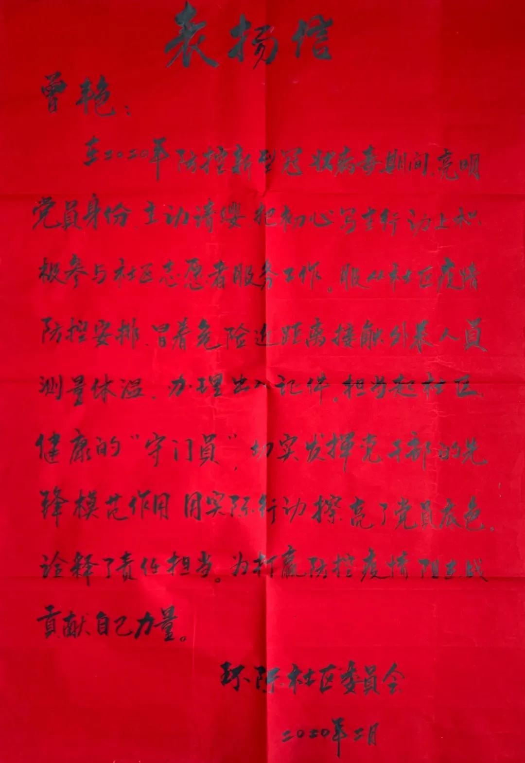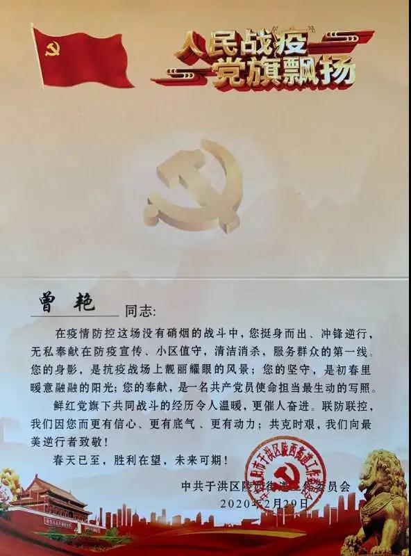 面对新冠肺炎防控工作,曾艳老师时刻牢记共产党员的初心与使命,主动请缨,直面风浪,秉承“生命重于泰山,疫情就是命令,防控就是责任”的理念,积极投身到社区疫情防控工作中。曾艳老师用实际行动践行了自己身为党员、教师、科研工作者的使命与担当。