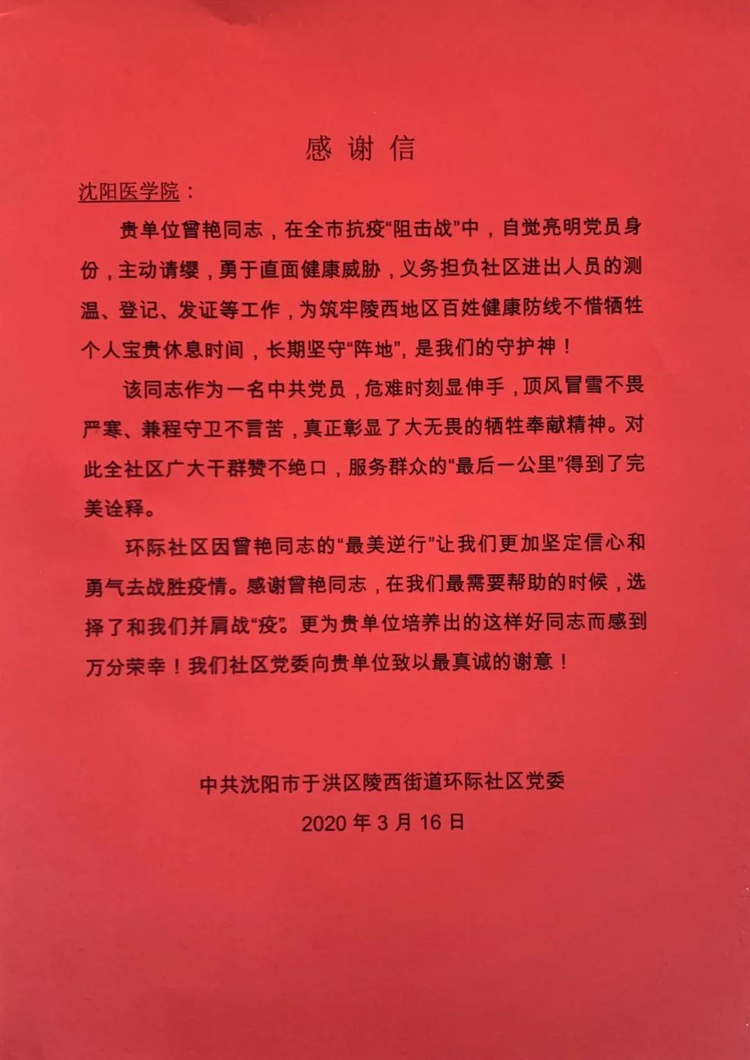 庚子新年,新冠病毒突袭神州大地。习近平总书记对各级党组织和广大党员干部提出要求:“让党旗在防控疫情斗争第一线高高飘扬”,共产党员们义无反顾,挺身而出。2020年4月3日,基础医学院收到了来自中共于洪区陵西街道环际社区党委的感谢信,信中高度赞扬了基础医学院免疫教研室曾艳老师危难时兼程守卫不言苦,顶风冒雪不畏严寒的大无畏牺牲精神。