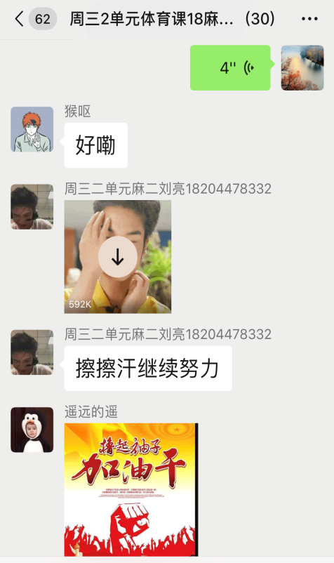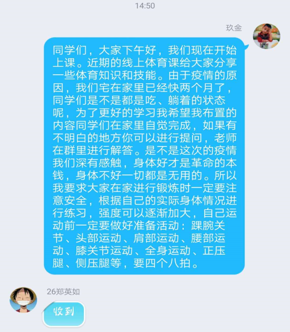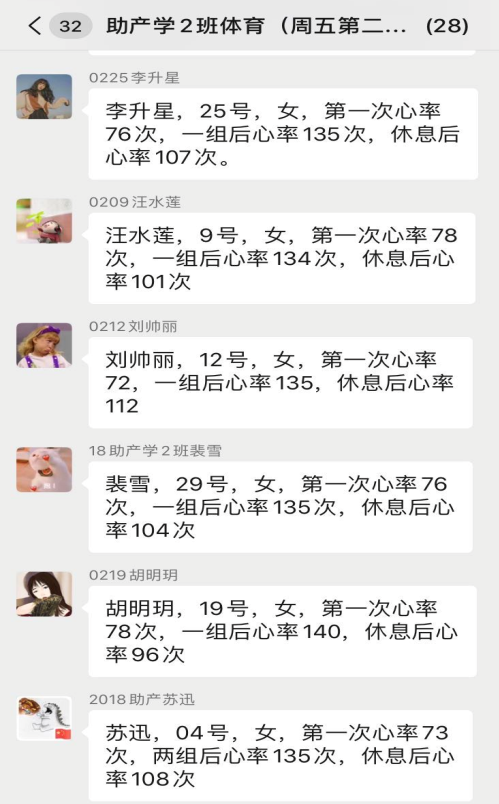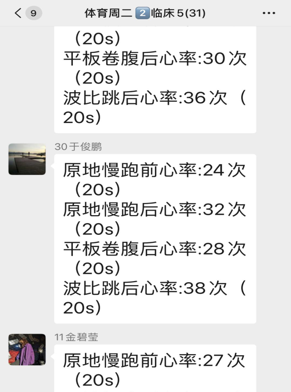 及时做好评师、评学工作,根据线上学习效果和学生反馈,不断调整教学方案。下课前要求每位学生上传个人心率情况,确保体育锻炼安全有效。