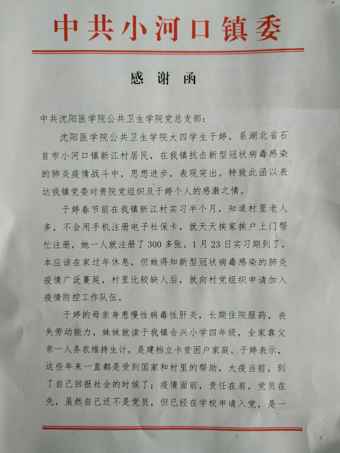 她的表现受到石首市委的肯定和广大群众的赞誉,带动了一批志愿者投入到这场没有硝烟的战役中,让小河口镇的工作人员和居民群众都备受鼓舞,同时坚定了大家的信心。石首市副市长姚周岸2月1日到小河口镇检查疫情防控工作时,特别强调要加大宣传力度,对于婷等两位先进典型要做好事迹宣传,鼓舞广大群众壮志。石首市小河口镇党委特此向米兰milan官方网站发送感谢函以感谢学校对她的培养。2月7日荆州日报网报道了于婷的事迹。2月14日《沈阳日报》帅正新闻对她的先进事迹进行了报道。