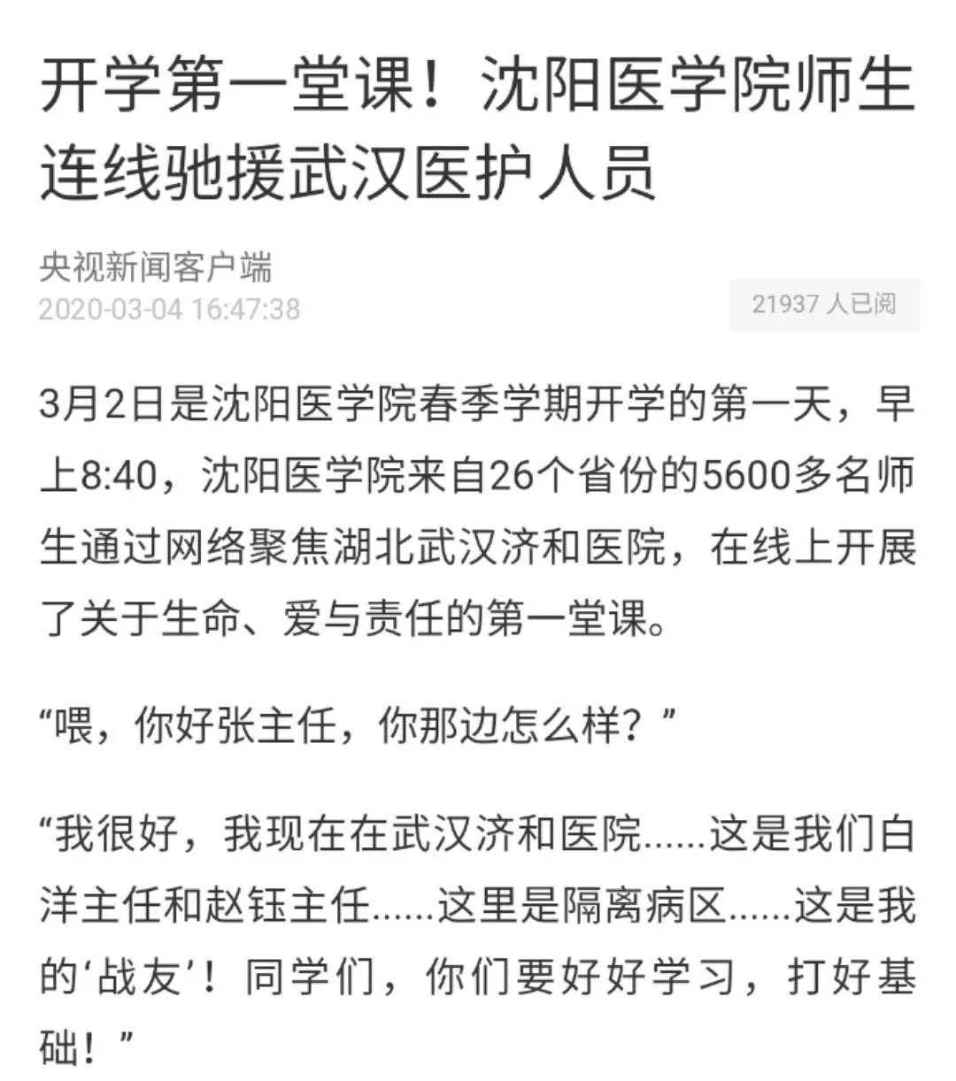 央视新闻客户端人民网报道米兰开学第一课!全校师生连线驰援武汉医护人员