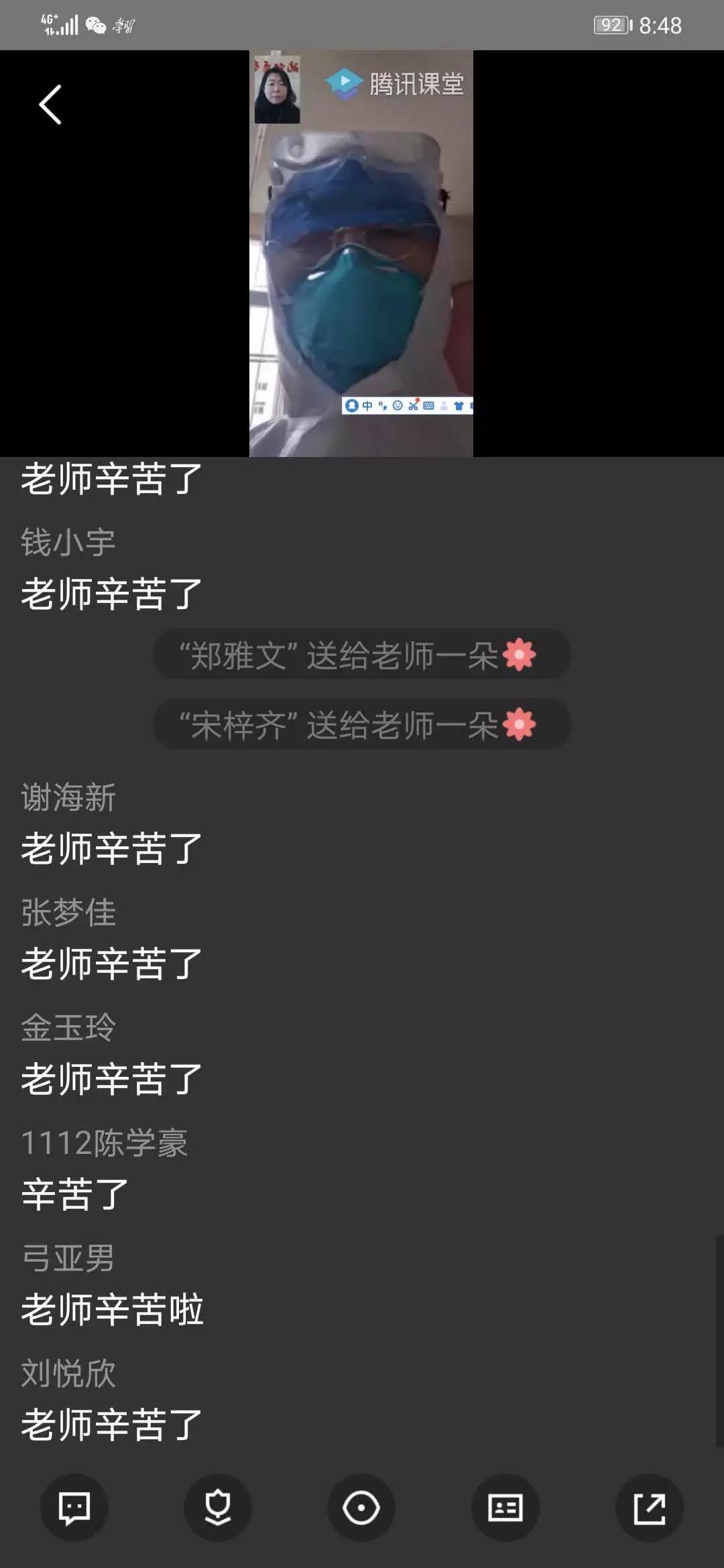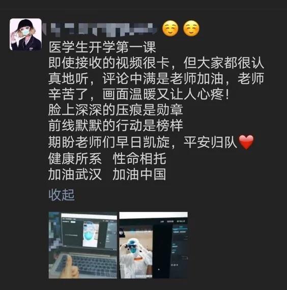 口罩,护目镜,防护服、只知道他们是谁却看不到他们的模样,断续的声音,晃动的画面,穿梭的人影,虽然看不清细节,却依然清晰感受到隔离病区里的紧张和忙碌。此次连线的三位老师分别是米兰milan官方网站附属第二医院重症医学科主任医师张汝峰;米兰milan官方网站附属中心医院感染科主任医师赵钰和米兰milan官方网站附属第二医院感染科护士长白洋,他们驰援武汉已经一月有余,作为临床教师的他们,既是抗疫最前线第一批驰援的逆行英雄,又是三尺杏坛上教书育人的典范。他们用实际行动为新学期的同学们打气加油。同学们纷纷留言:“老师辛苦了!”“老师愿你们早日平安归来!”……