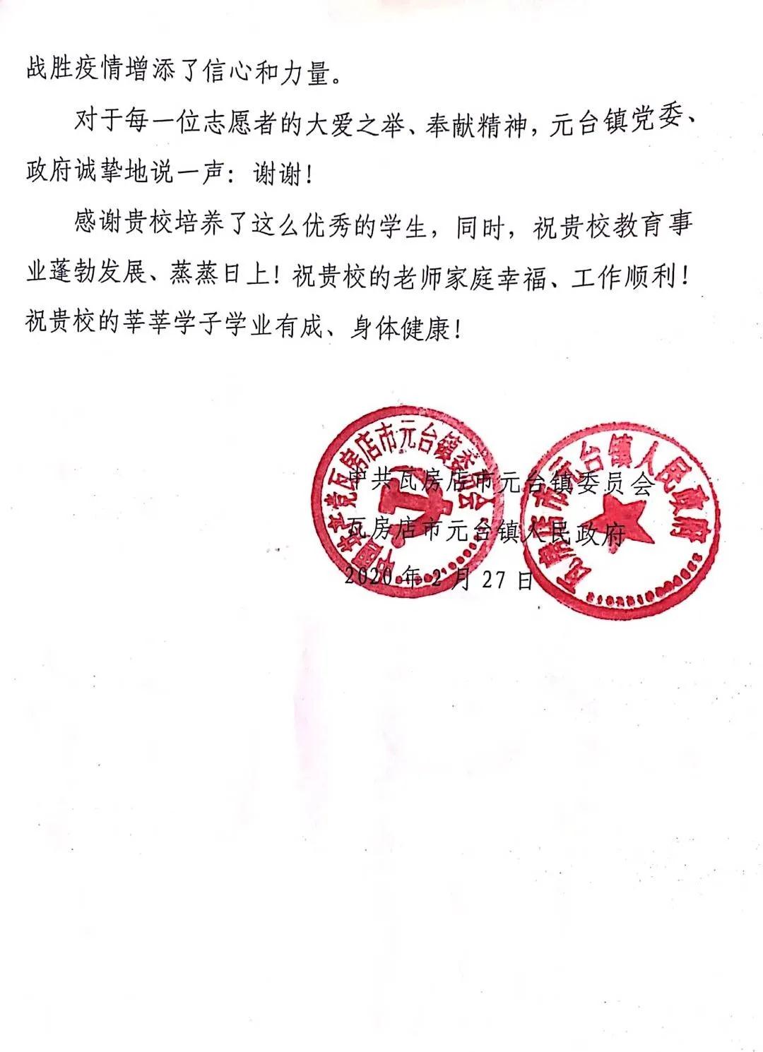 2020年2月27日,米兰milan官方网站收到了一封来自中共瓦房店市元台镇委员会的感谢信,瓦房店市元台镇人民政府以一封感谢信的形式特此感谢肖吉泳同学在疫情防控工作中的自我奉献、大爱之举,并表示对学校培养出如此优秀的学生的感谢。