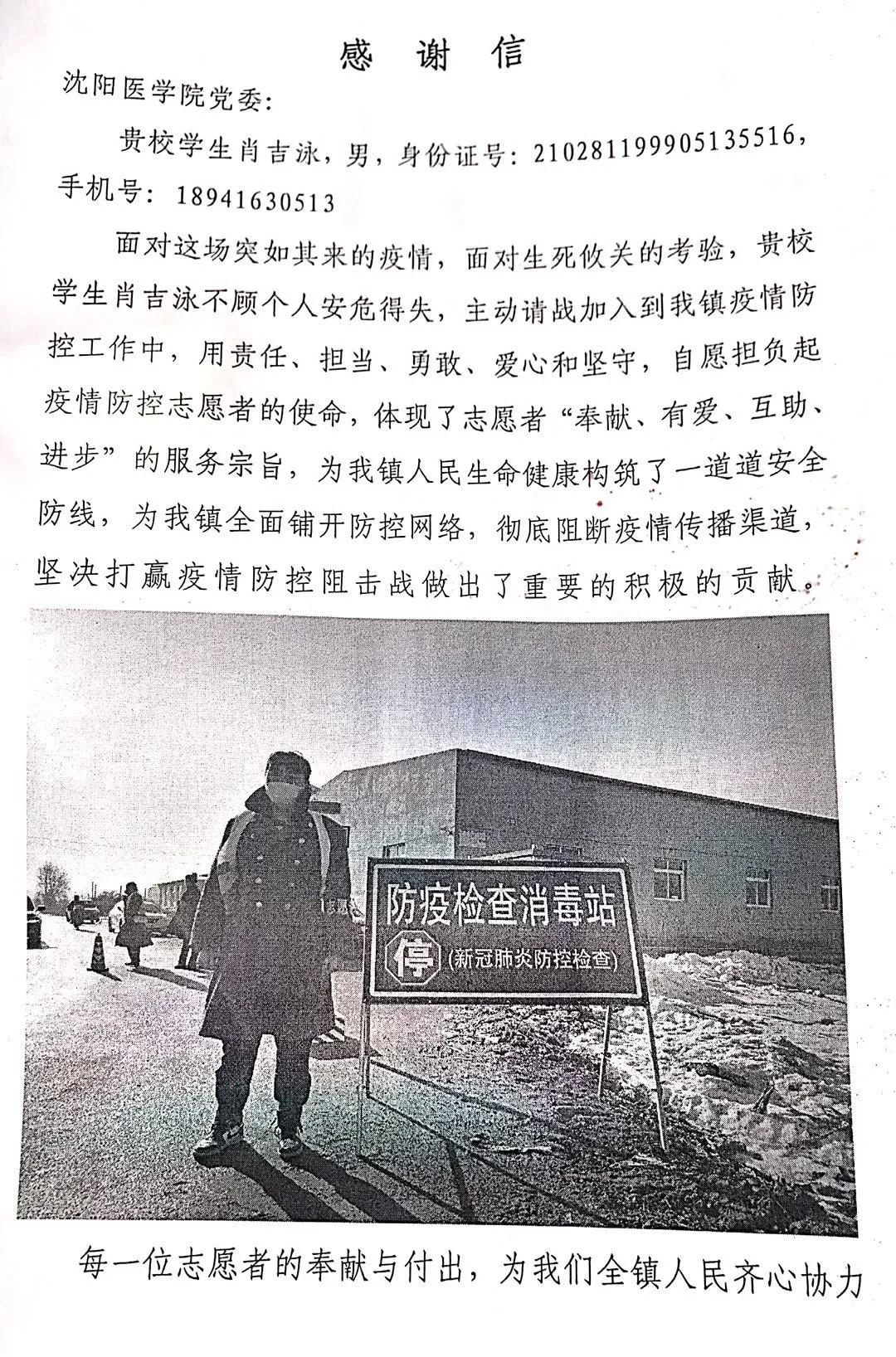 疫情当前,身为一名医学生,肖吉泳同学感到重任在肩、义不容辞,于是他主动递交了防控疫情志愿者申请。通过申请后,肖吉泳同学于2月14日-2月25日被瓦房店市政府分配到离家十几公里外的吴窑村进行志愿服务,正式成为志愿者团队的一员。作为志愿者的他在加强自身防护的情况下,志愿投入到防控疫情卡点工作中,对进出村口居民进行测量体温;询问村民的去往并仔细登记在册,主动拦下未佩戴口罩的居民并要求其佩戴口罩后方可进出村口、核实并适时阻拦外来人员;他还向居民积极宣传防控疫情的思想,稳定了大家在疫情期间的情绪。他为元台镇战胜疫情增添了信心;为疫情防控工作贡献出自己的力量。