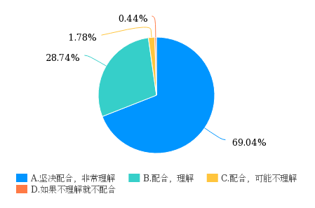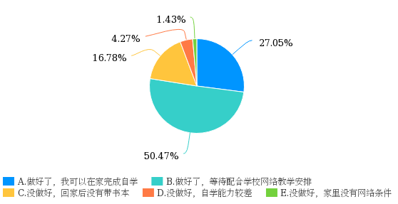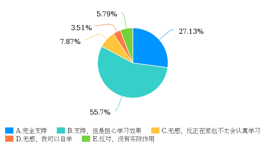 针对于延期开学高校大都积极开展网络教学形式,保证防疫期间“停课不停学”。调查结果表明,82.83%的学生支持网络教学,但是有55.70%的同学担心学习效果;77.52%的同学做好了延期开学的准备,27.05%的同学可以在家里完成自学,50.47%的同学等待配合学校网络教学安排;对于延期开学面临的问题中,41.32%的同学认为学校教学日程不明确,学习没有计划,35.88%的同学表示焦虑,没有学习状态,35.85%的同学担心影响暑假,还有35.50%的同学认为假期准备不足,不具备自学条件;如果开学后,学校针对疫情开展相关防控措施,69.04%的同学表示坚决配合,非常理解。详见图5-8。