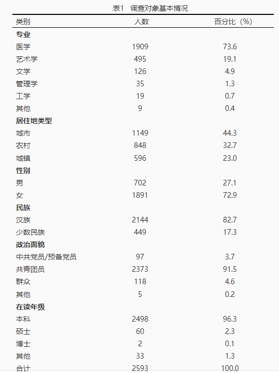 在调查的2593名学生中,包括医学、艺术学、文学、管理学等专业。详情见表1。