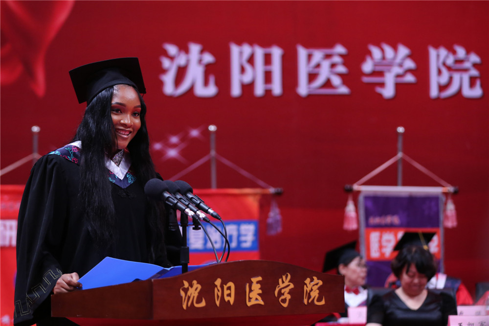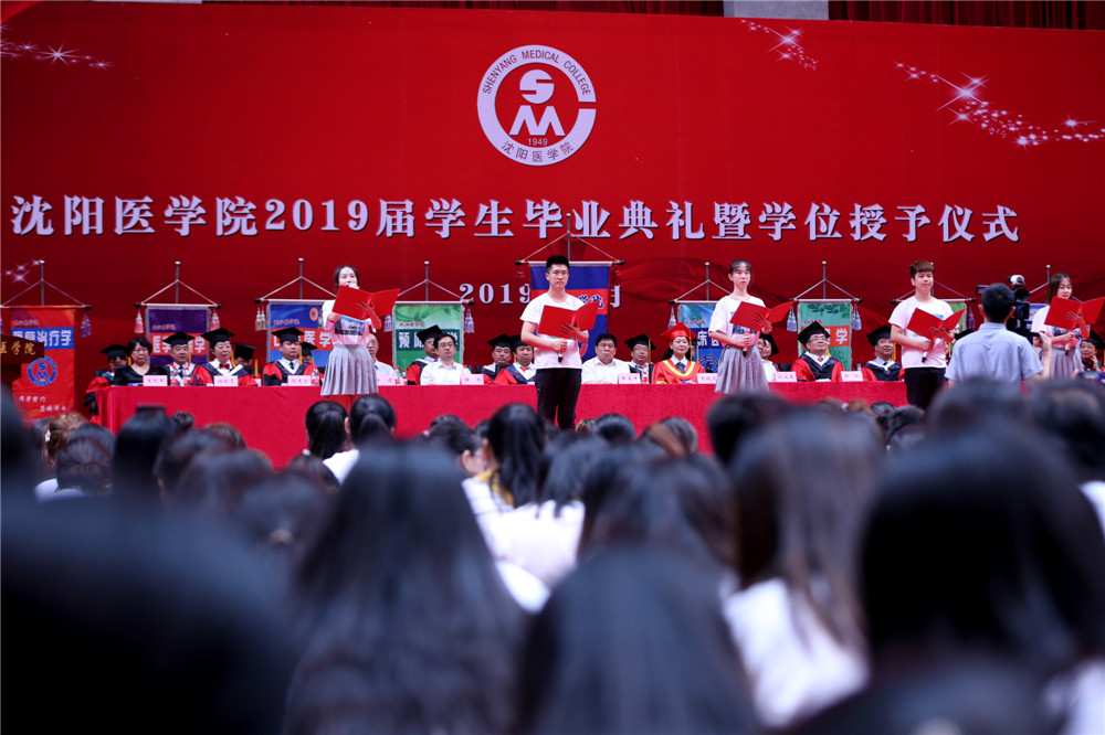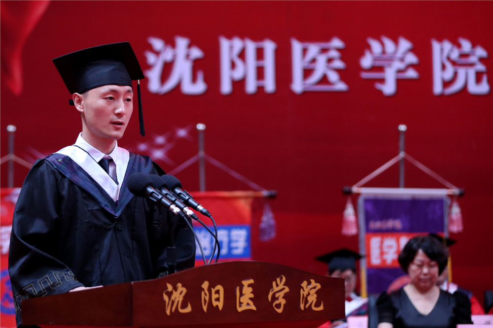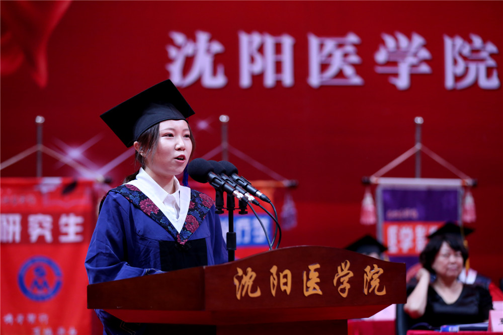 2019届本科生毕业生代表、基础医学院临床医学专业冯猛同学,2019届留学生毕业生代表马红同学,2019届研究生毕业生代表、病原生物学专业李冰玉同学代表毕业生表达了对母校的无限依恋,对恩师的敬佩感激,对同窗的惜别不舍以及对未来的憧憬和畅想。教师代表、基础医学院高兵教授向全体毕业生顺利完成大学学业表示祝贺,寄语广大学子要终身保持学习热情,要学会感恩,脚踏实地,心怀梦想,坚定前行。王海洋等同学代表全体在校生为即将毕业的学长们献词《时光隽永沈医情深》。