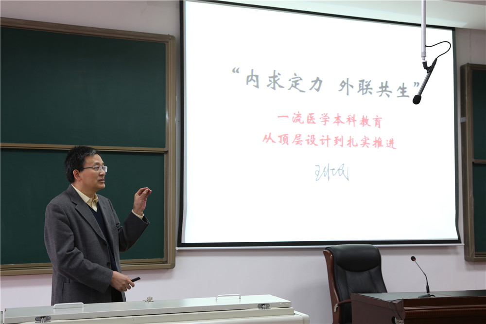 培训首先由北京大学医学部副主任王维民教授做“内求定力 外联共生” 一流医学本科教育从顶层设计到扎实推进的专题报告。王维民教授围绕新世纪医学教育的改革内容与方向,从医学教育发展的背景和趋势、我国一流大学建设的现状、医学教育特点与规律、医学教育质量改进全球标准等方面为全体干部做了精彩的阐释,使大家受益匪浅、深受启发。