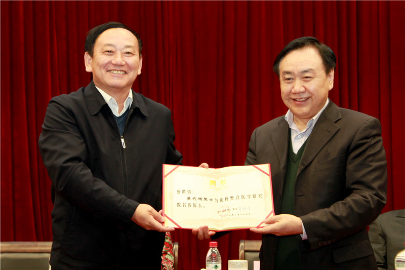 党委书记张广印向樊代明院士颁发名誉院长聘书。