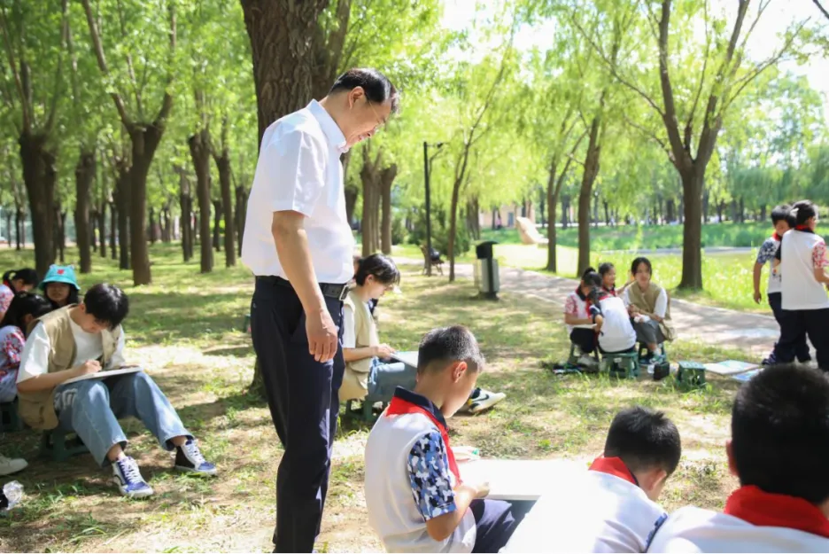 初夏的校园,碧空如洗,绿草如茵。6月2日,波光粼粼的博学湖畔,一群身着校服,系着红领巾的小学生们正在校园里写生,他们满眼憧憬地在临湖的草地上,将心目中大学的样子描绘在画板上,老师和志愿者们在旁边手把手地指导。学校党委书记任甫教授和校长吴玉东教授、副书记王凯军和路过的师生一起,一边满含笑意地驻足欣赏小朋友的作品,一边接受着小朋友们叽叽喳喳的询问“老师,我将来能不能上这所大学?”“老师,我能不能常来这儿玩”?