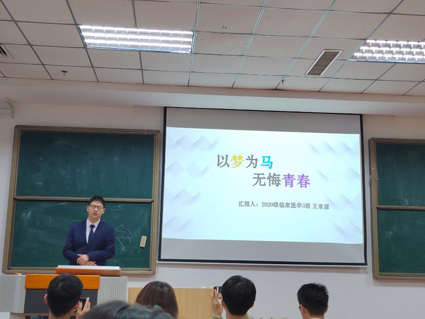 本次优秀大学生宣讲人为2021-2022年度国家奖学金获得者、2020级临床3班的王常源同学和2021-2022年度辽宁省政府奖学金获得者、2020级检验1班李祎同学。王常源同学以《以梦为马,无悔青春》为主题作了报告,他说大学生作为祖国的未来和希望,承担着十分重要的历史使命,大家应该坚定理想信念、提升能力素质、不断自我突破,始终坚持自己的初心,以梦为马,不负韶华。李祎同学以《努力活成自己想要的模样》为主题分享了自己的学习生活经历,她提到,世上无难事,只要肯攀登。一个人要坚定自己的理想信念,勇于走自己想走的路,活成自己想要的模样,决不被前进道路上的坎坷曲折所阻挠。