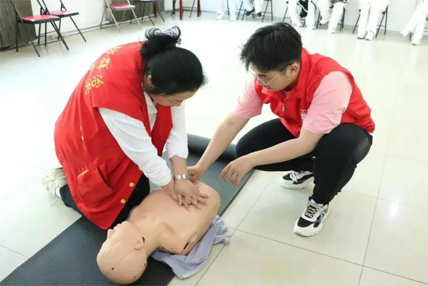 活动现场,体育教学部李潇潇老师和太极拳社团学生带领社区居民学习了八段锦,帮助他们用健康的运动方式科学锻炼身体。随后,学生志愿者们为社区居民进行了健康知识宣讲,主要内容包括高血压、冠心病等老年人常见病的发病原因与预防措施,以及日常生活中的保健误区。最后,学生志愿者们现场演示了心肺复苏的正确步骤,指导社区居民使用模拟人道具进行心肺复苏练习,帮助居民掌握急救要领。