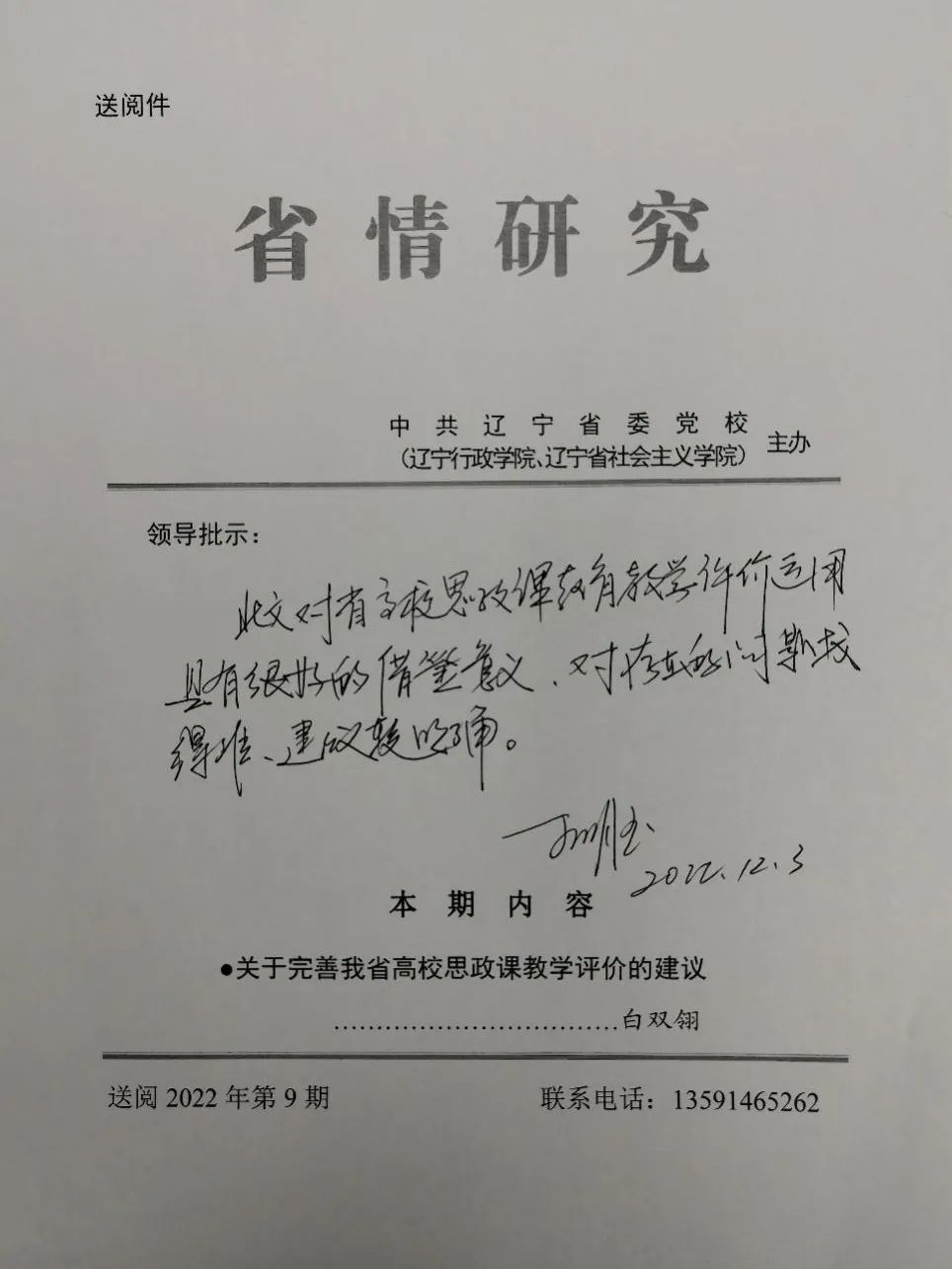 近日,米兰马克思主义学院教师白双翎博士撰写的研究成果《关于完善我省高校思政课教学评价的建议》在中共辽宁省委党校主办的《省情研究》上发表后,获时任辽宁省副省长、现任辽宁省政协副主席、党组副书记王明玉的批示。王明玉同志批示:“此文对省高校思政课教育教学评价运用具有很好的借鉴意义,对存在的问题找得准,建议较明确。”