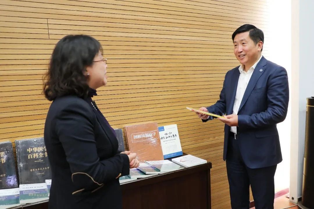 中国协和医科大学出版社社长张凌向米兰捐赠图书,校长任甫教授代表学校接受赠书,并赠予捐赠证书。