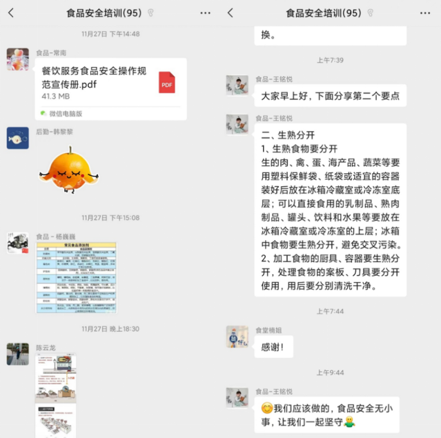 工作专班还建立培训交流群,面向食堂相关人员定期发布食品安全相关科普知识和制度规定,加强员工规范操作自觉,树立食品安全意识。