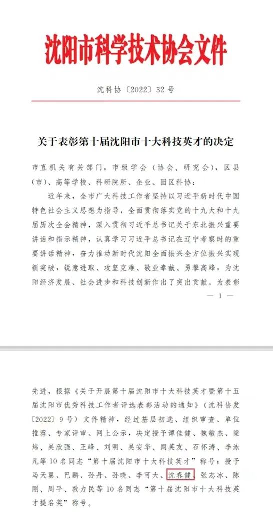 日前,沈阳市科学技术协会公布了《关于表彰第十届沈阳市十大科技英才的决定》,米兰附属第二医院副院长沈春健荣获“第十届沈阳市十大科技英才提名奖”称号。