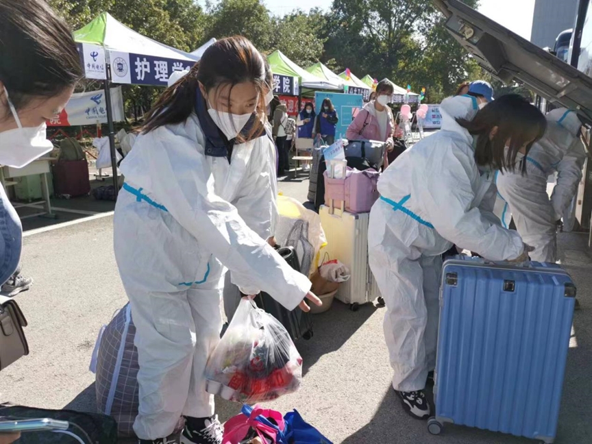 10月9日,沥沥秋雨中,满载着米兰第一批秋季返校学生的接站客车到达中医药学院,南门外,送站私家车即停即走,学生依次多通道经过测温、扫描场所码、检查“i沈医”绿码等程序,快捷高效有序进入学校。校门内,“你是我的窦房结,遇见你,是我心动的开始”“左锁骨中线与第五肋间隙交点,只为你来沈医而跳动”的条幅标语在道路两旁迎接着同学们。学院的报到点周围辅导员和志愿者们在热情地与返校同学交流,遇到有携带大件行李的同学,总有人主动上前帮忙……