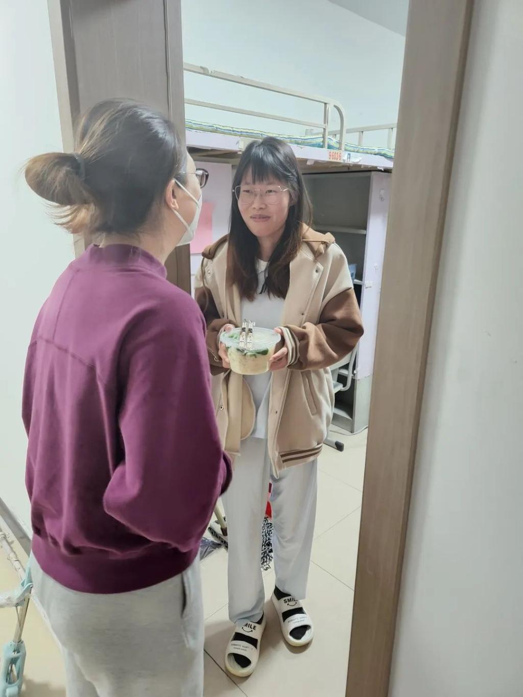 为了让久别校园的同学们能感受到来自学校和老师的关怀,她通过对在校生大数据的筛查,发现报到期间九号楼共有3名同学过生日。她原本打算为这三名同学过集体生日,但考虑到疫情防控要求下楼宇实施静态管理,便改变方式,由她带领楼层长老师进入3名同学的寝室,分别为她们过生日、送祝福。定制的鲜花、精美书籍《你当像鸟飞往你的山》、老师手写寄语的专属生日卡以及热腾腾的长寿面,让“小寿星”们欢声不断、惊喜连连。这既是对学生进行感恩教育,又彰显了学校和学院的大爱文化。