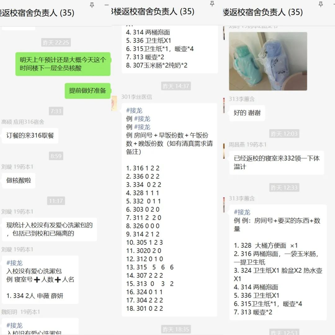 疫情防控,“快”字当头。学校的相关安排部署第一时间通过五级管理体系逐级快速传达,最后由各寝室长转达给学生,学生反映的问题通过楼层长汇总后上报,直接反馈给相关部门,保证了“上传下达”的畅通,确保了疫情防控工作快、严、准。