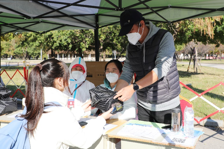 在学校南门入口处老师们核验身份、核对核酸报告、检查入校审批通过“笑脸”,入校流程便捷迅速、安全有序。
