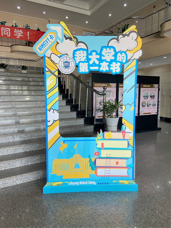 “我大学的第一本书”立牌静静地伫立在图书馆大厅,等待着新同学们带着自己在大学期间借阅到的第一本书来拍照打卡。