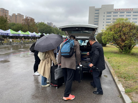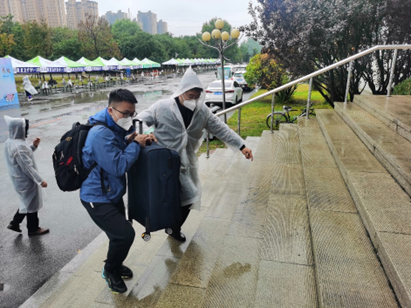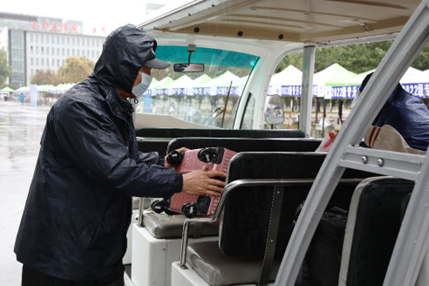一辆辆摆渡车在校园内忙碌穿梭着,师生志愿者忙前忙后搬运行李,仿佛永远不知疲倦。一把把雨伞阻隔了风雨,撑起了师生连心桥。
