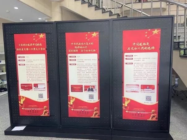 主题教育开展以来,图书馆在一楼大厅举办“阅读新时代,奋进新征程”课程展示活动,课程由中共中央党校专家讲授,包括“中华民族伟大复兴的规律性认识”“中国道路是历史和人民的选择”“习近平经济思想学习纲要”“习近平总书记关于理想信念的重要论述”等,帮助师生增强爱党爱国爱社会主义的坚定信念,为奋进新征程积蓄磅礴力量。