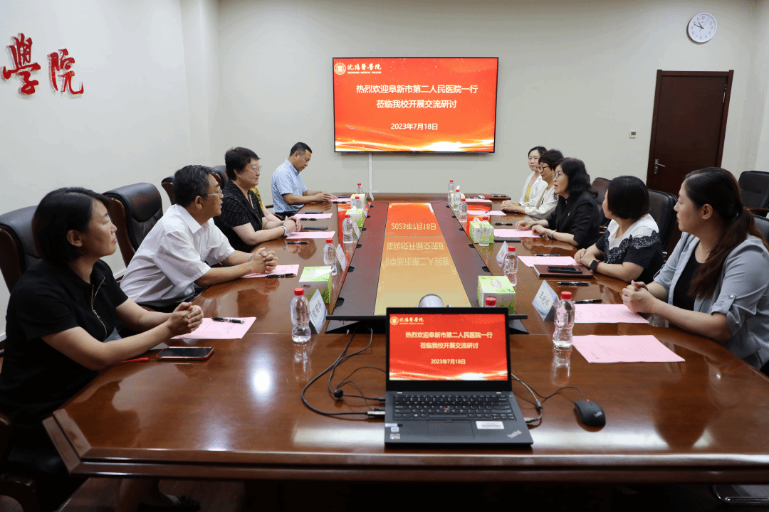 会上,副院长李荣梅对阜新市第二人民医院一行来访表示欢迎,她简要介绍了学校的办学发展、专业建设、师资力量和实验室建设等情况。她表示,双方应充分利用学校和医院双方的优势与特长,立足国家大健康发展战略,围绕辽宁全面振兴新突破三年行动,齐心协力合作共赢,助推区域经济社会高质量发展。针对校院合作,李荣梅副院长提出三点看法:一要进一步健全合作机制,实现双方共赢发展。本次交流研讨为校院双方在医疗、教学、科研等方面有序开展相关合作提供了契机,校院双方要借此机会,以人才培养为中心,以医教协同为推手,建立“培养—就业”联动机制,将高质量人才培养理念贯穿于教育教学全过程,实现共同发展。二要进一步深化合作交流,不断拓宽合作领域。学校和医院要实现资源共享、优势互补,积极探索创新人才培养体系,为培养面向基层、理论基础扎实、实践能力强、德才兼备的应用型医学相关人才做出积极贡献。三要进一步细化合作方案、实现医教深度融合。医教协同是学校提高人才培养质量,提升办学水平的必由之路。医院要遴选临床一线的业务骨干为学生授课,将医学教育与临床实践有效结合,培养更多更好的适应新时代医疗发展的医学专业人才。