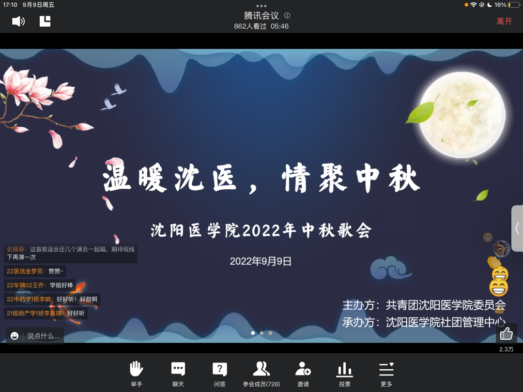 月满西楼,情暖中秋;共赏皓月,感念师恩。值此中秋佳节来临之际,为继承和发扬中华优秀传统⽂化,营造欢乐祥和的节日氛围,增强学生对于中华传统文化的认同感、归属感和⾃豪感,展现米兰传统与现代兼容并蓄的校园文化魅力,9月9日晚,由校团委主办的“温暖沈医,情聚中秋”米兰milan官方网站2022年中秋歌会在线上拉开帷幕,千余名师生相聚云端,共庆佳节。