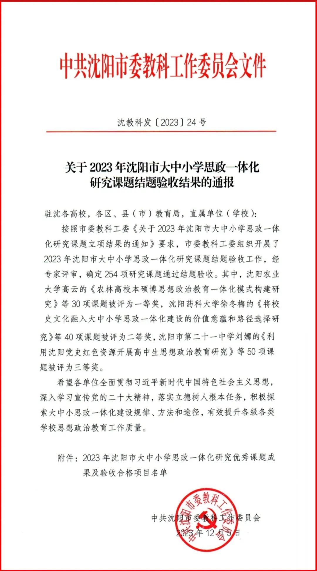 近日,中共沈阳市委教科工作委员会发布《关于2023年沈阳市大中小学思政一体化研究课题结题验收结果的通报》,米兰2个项目获评一等奖,1个项目获评二等奖,位列驻沈同类高校前茅。