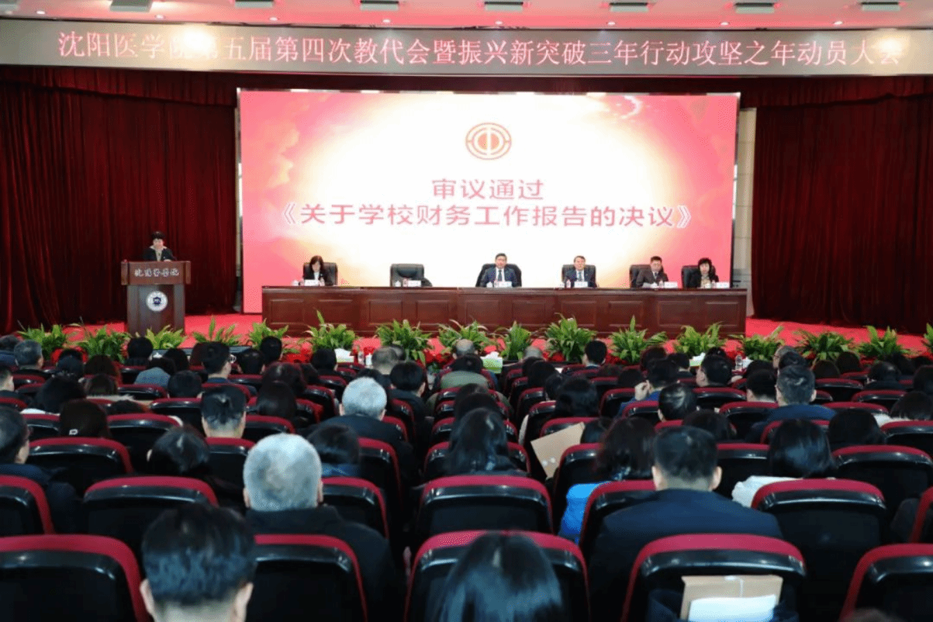 学校党委副书记、院长吴玉东以《凝心聚力、笃行实干,奋力书写学校高质量发展新篇章》为题作学校工作报告。报告中全面总结了2023年学校发展建设取得的成绩。一是强化固本培元、争创一流,党建工作实现新跃升。高质量开展主题教育,组织工作提质增效,宣传思想工作持续深化,统战和群团工作不断加强,纪检监察工作纵深推进。二是聚焦发展大事,攻坚克难,学校高质量发展迈上新台阶。创建大学工作扎实推进,规划行动计划有序实施,医养结合育人模式初具雏形,人才培养成效显著提升。三是坚持学科引领、精准发力,学校内涵发展取得新成效。教育教学改革不断深化,学科专业建设强力推进,高水平科研成果佳绩频传,人才引育力度持续加大,国际化办学逐步深化。四是坚持师生为本、汇聚力量,民生民心工程再获新进展。国际学院完成项目联合竣工和消防验收,研究生和部分本科生顺利入驻。完成7620万元近4千件教育贴息贷款设备招标采购工作,新建及改造教学实验室56间。改造扩建咖啡厅、校园购物中心,完成办公和教学用房调整搬迁。提高教职工食堂伙食标准、教职工体检经费标准,推动发展成果共享,教职工幸福指数节节攀升。五是深化体制改革、一体推进,附属医院各项工作打开新局面。附属中心医院获批辽宁省综合类区域医疗中心,成为全省8个综合类区域医疗中心之一。获批辽宁省临床重点专科4个。2022年度全国三级公立医院绩效考核B+,位列市属医院第一名。附属二院获得沈阳市科技创新平台2022年度绩效评估“优秀A档”。皇姑院区扩建工程住院楼完成封顶。附属康复医院完成事业单位法人证书办理和账户开立,医院内部装修工作已完成总工程量的85%。