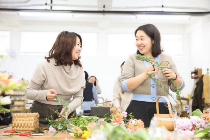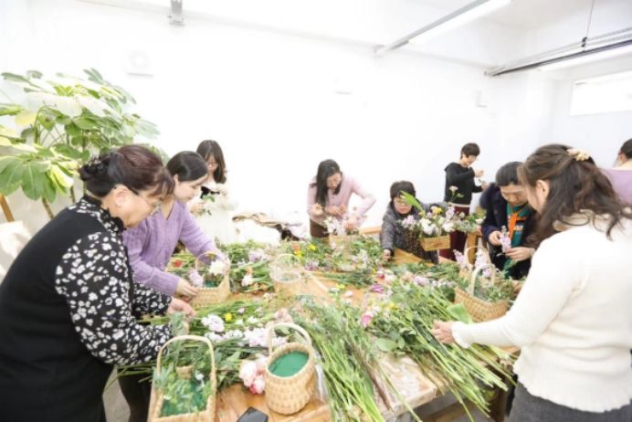 校工会联合沈医文创“卿云艺术工坊”举办了插花课堂活动。活动现场,花香四溢、别开生面。花艺师从花材选取、裁剪、造型等多方面讲解插花技巧。女教职工们边学习边实践,尽情发挥想象力和创造力,修剪花枝、整理花朵、构思扦插位置,忙得不亦乐乎。活动中大家相互欣赏、相互赞誉,在创作中体会插花艺术的雅趣,感受鲜花传递的美好。