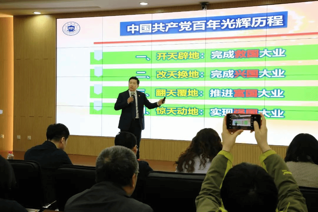 首先,任甫书记从习近平总书记于2021年7月1日在《求是》杂志发表的重要文章《学史明理、学史增信、学史崇德、学史力行》为引,以时间为线,回顾了中国共产党的百年光辉历程,从开天辟地的“救国”伟业、改天换地的“兴国”伟业讲到翻天覆地的“富国”伟业、再到惊天动地的“强国”伟业。