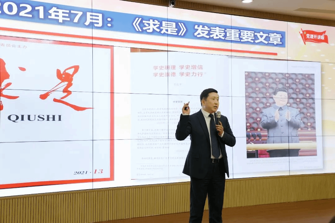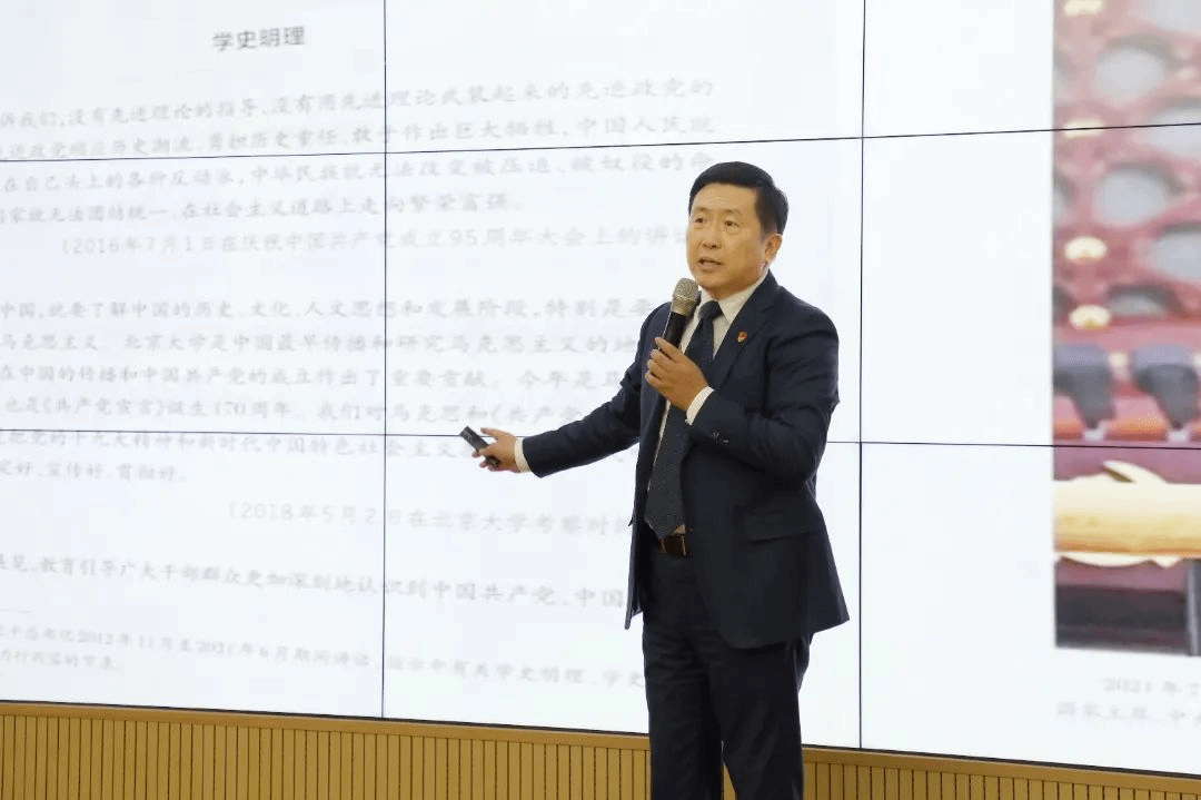 他指出,百年党史,波澜壮阔,蕴藏着矢志不渝奋斗的精神密码,彰显着共产党人的卓越智慧,解读着党的事业砥砺前行的制胜法宝。从诞生之初的53名党员到如今的9100多万名党员,从第一次党代会只能秘密召开到在全球最大的社会主义国家长期执政,从星星之火的初创组织到引领中国逐步走近世界舞台中央的大党,从党的一大,一直讲到党的二十大;从“毛泽东思想”,讲到“邓小平理论”、“三个代表”重要思想、“科学发展观”,再讲到“习近平新时代中国特色社会主义思想”。
