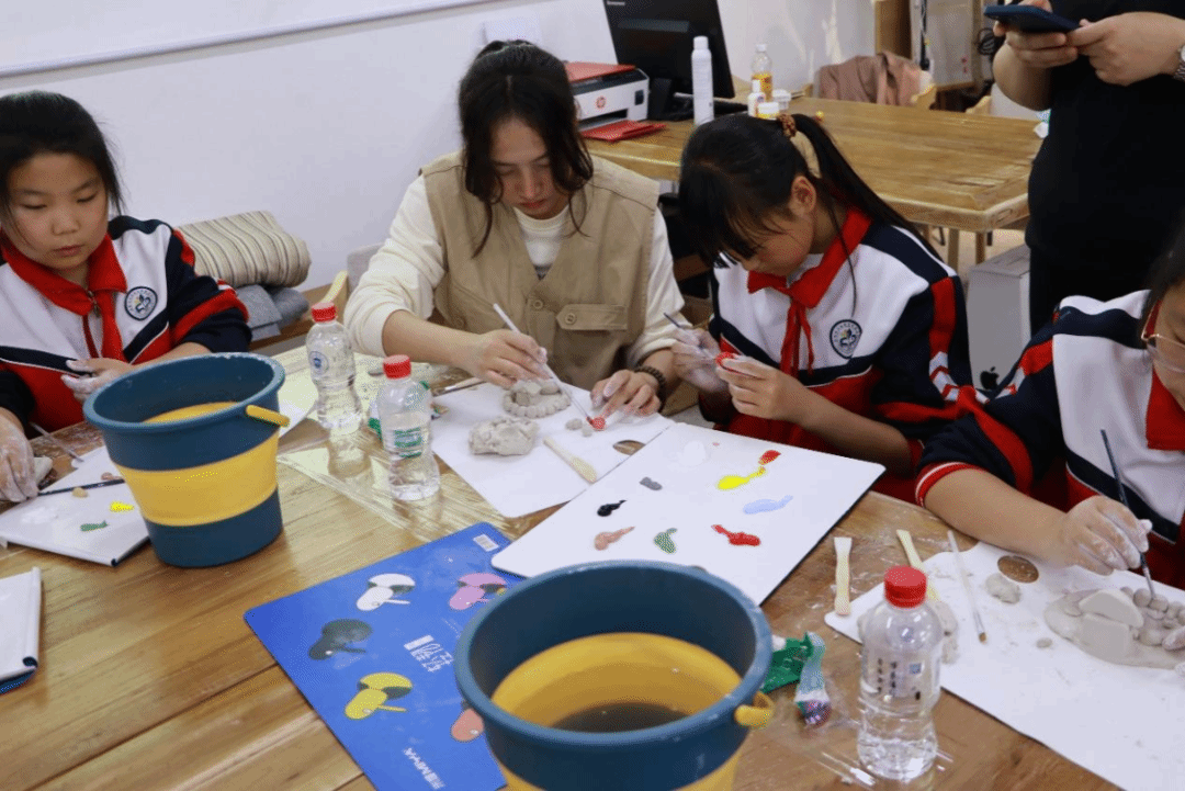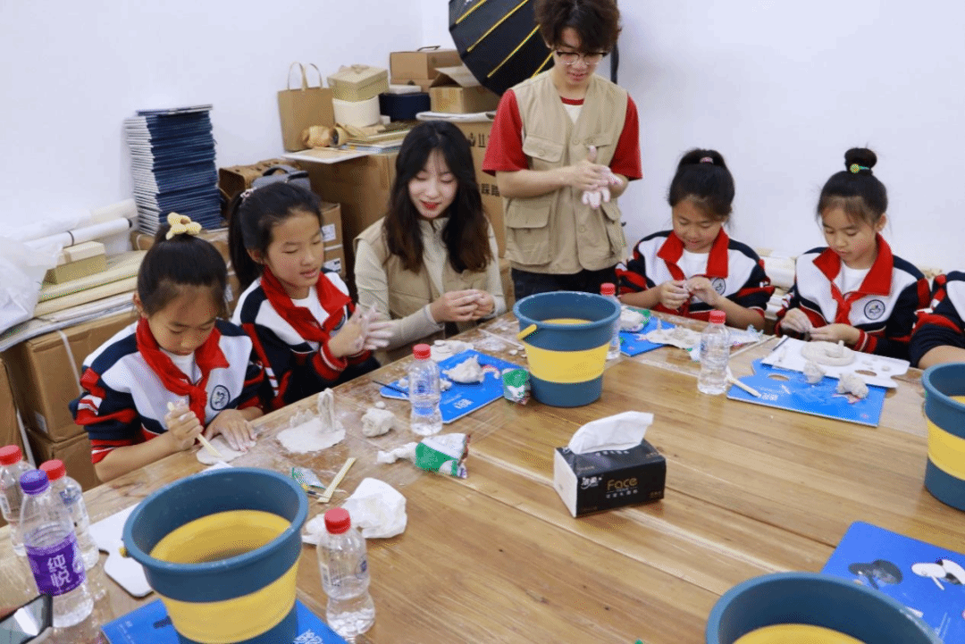 在这里由马克思主义学院美育教研室主任金亚哲老师介绍了卿云艺术工作坊的创建和工作情况,并给同学们上了一节生动的陶泥制作课。在“小教师”—马克思主义学院艺术实践工作坊的学生志愿者们的耐心细致的辅导下,小同学们动手实践,体验制作的乐趣,感受了美的艺术,激发了想象力和创造力,拓宽了视野。