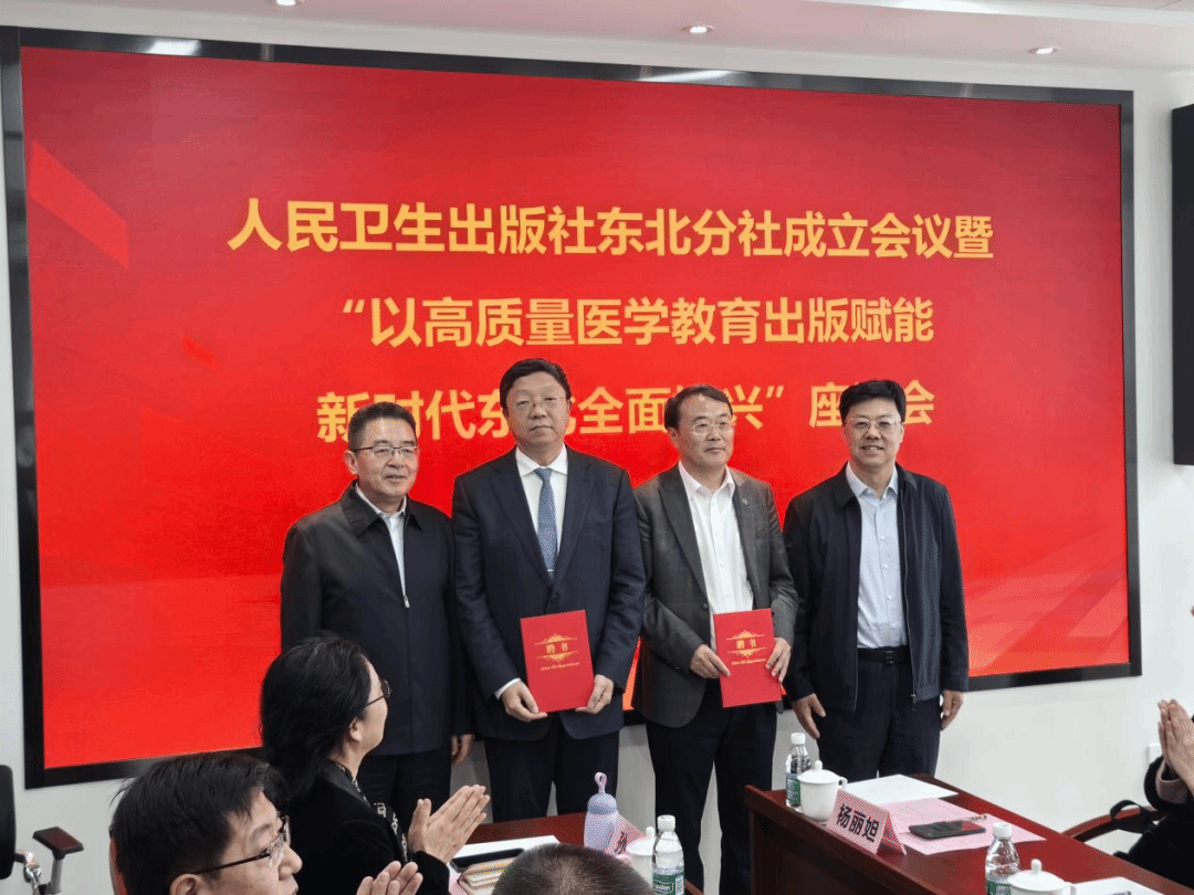 会上,吴玉东校长同”三省一区”其它兄弟院校的嘉宾共同为人民卫生出版社东北分社揭牌。