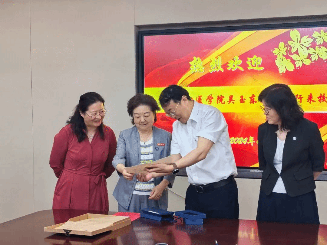 吴玉东校长代表学校向聂淑娟老师赠送了刻有她名字的专属校徽和文创纪念品,并诚挚邀请聂老师在今年的9月份重回母校与师生一起共庆母校75华诞。