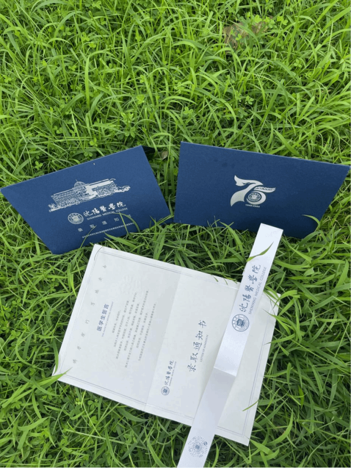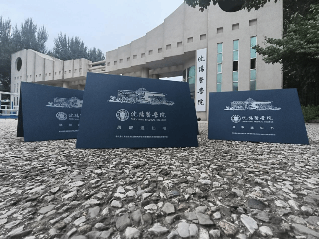 内页以浅米黄色为底、镶嵌银色边框,上半页由沈医“博学洁行、厚德济世”的校训和医学生誓言组成。校训“博学洁行、厚德济世”印于内页左上角,烙印在代代沈医人的心中,体现了沈医人植根医学热土,熔铸救死扶伤之理想;展现了沈医人矢志时代前沿,投身医疗进步之奋斗。校训下是医学生誓言,在步入米兰milan官方网站之际,每一位新生都将立下宏愿,志愿献身医学,以高尚的医德、精湛的医术,为人类的健康事业贡献自己的力量。医学生誓言下背景为压凹工艺的篆体“沈医”,行笔圆转,线条流畅,体现了医学教育的庄重与严谨。篆书线条的流畅与圆转,象征着医学知识的博大精深和医学实践的精准细腻,同时也寓意着医学人才在成长道路上需要不断学习和精进。下半页印有米兰milan官方网站校徽、录取通知书编号和校长签名。腰封中央用蓝色UV印制米兰milan官方网站校徽和校名。