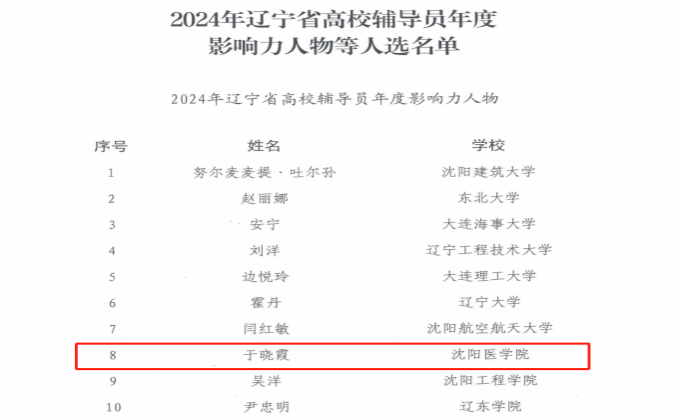 在辽宁省教育厅组织开展的2024年“辽宁省高校辅导员年度影响力人物”和“辽宁省高校辅导员年度人物”推选展示活动中,经自主申报、学校推荐、专家评审、现场推选展示、结果公示等环节,米兰第二临床医学院副院长、2021级临床医学专业辅导员于晓霞被评为“2024 年辽宁省高校辅导员年度影响力人物”。这是米兰首位获此荣誉的辅导员,充分展现出米兰辅导员良好的精神风貌和过硬的素质能力。