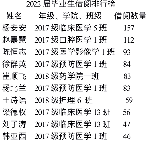 五月中旬以来,图书馆启动“毕业生离校手续”办理工作,顺利完成了“图书快递接收”“毕业生账号注销”等工作,为全校91个毕业班级、3200余名毕业生办理了离校手续。与此同时,图书馆还对本届毕业生的图书借阅情况进行了排行。学海无涯,书山有路,希望毕业生们在离开学校后依然可以保持这一份学习的热情,并把它转化为贡献祖国医疗事业的不竭动力。